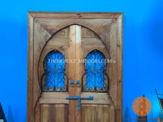 Traditional Geometric Carved Large Moroccan Double Panel Wooden Indoor Outdoor Moroccan Wooden Door With Iron Window Fer forgé Architectural