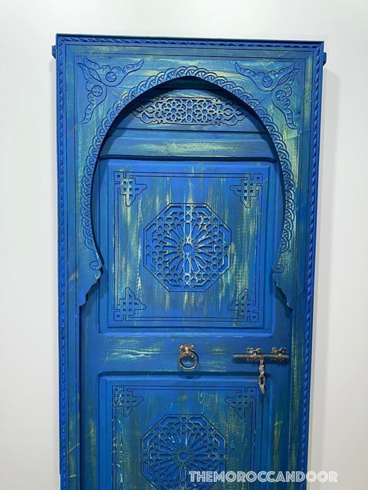 Hand-Carved Moroccan Wooden Door – Blue Geometric Design | Vintage Entryway Door | Custom Solid Wood Door